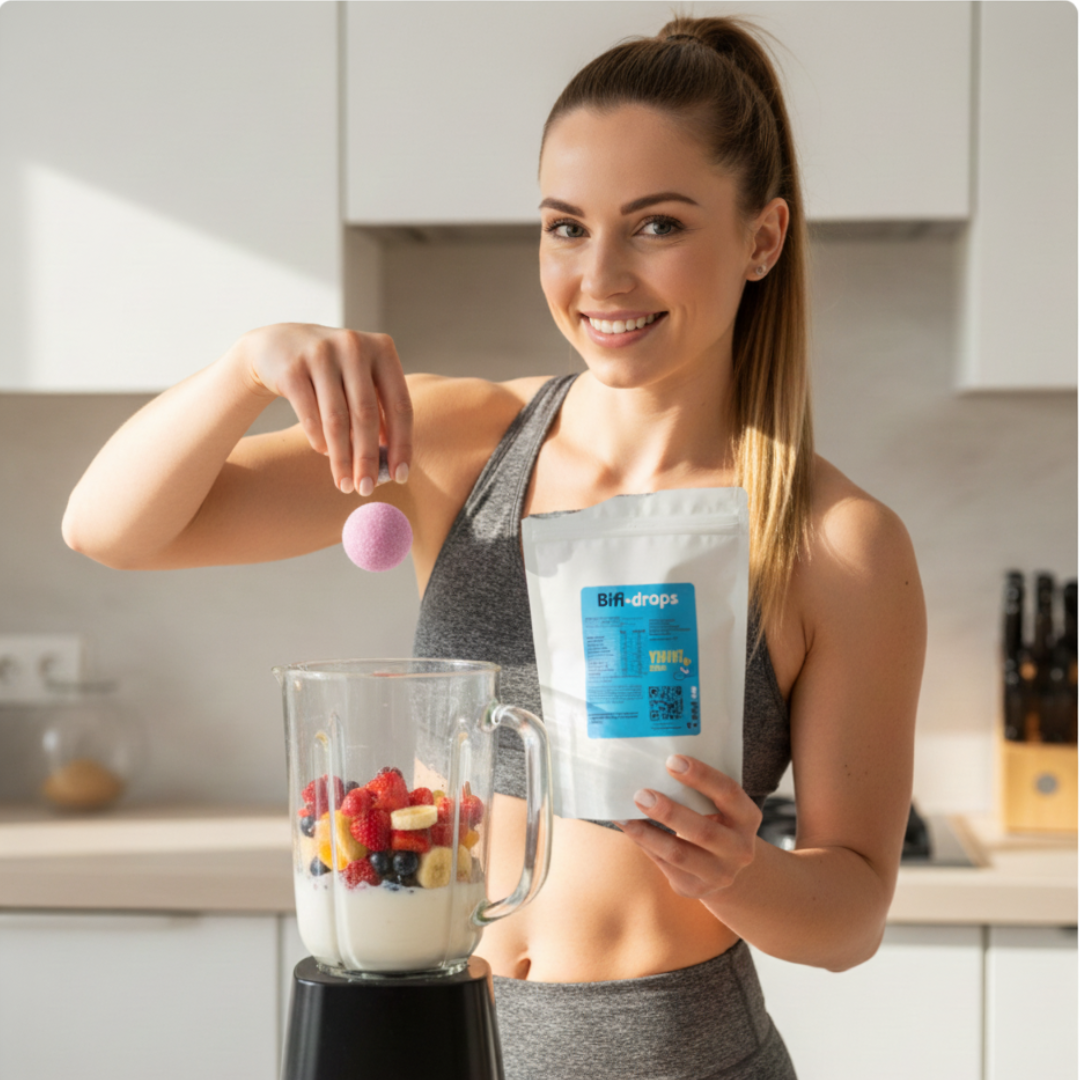 Convierte tu batido en un superbatido con Bifi-drops. Son esferas con probióticos vivos que apoyan tu salud digestiva e inmune, fáciles de usar y sin alterar el sabor.